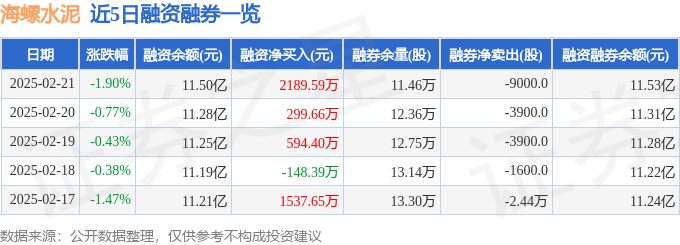 海螺水泥融资融券信息数据显现,融资方面,当日融资买入5773.39万元,融资归还3583.81万元,融资净买入2189.59万元,接连3日净买入累计3083.64万元。融券方面,融券卖出7100.0股,融券归还1.61万股,融券余量11.46万股,融券余额259.8万元。融资融券余额11.53亿元。